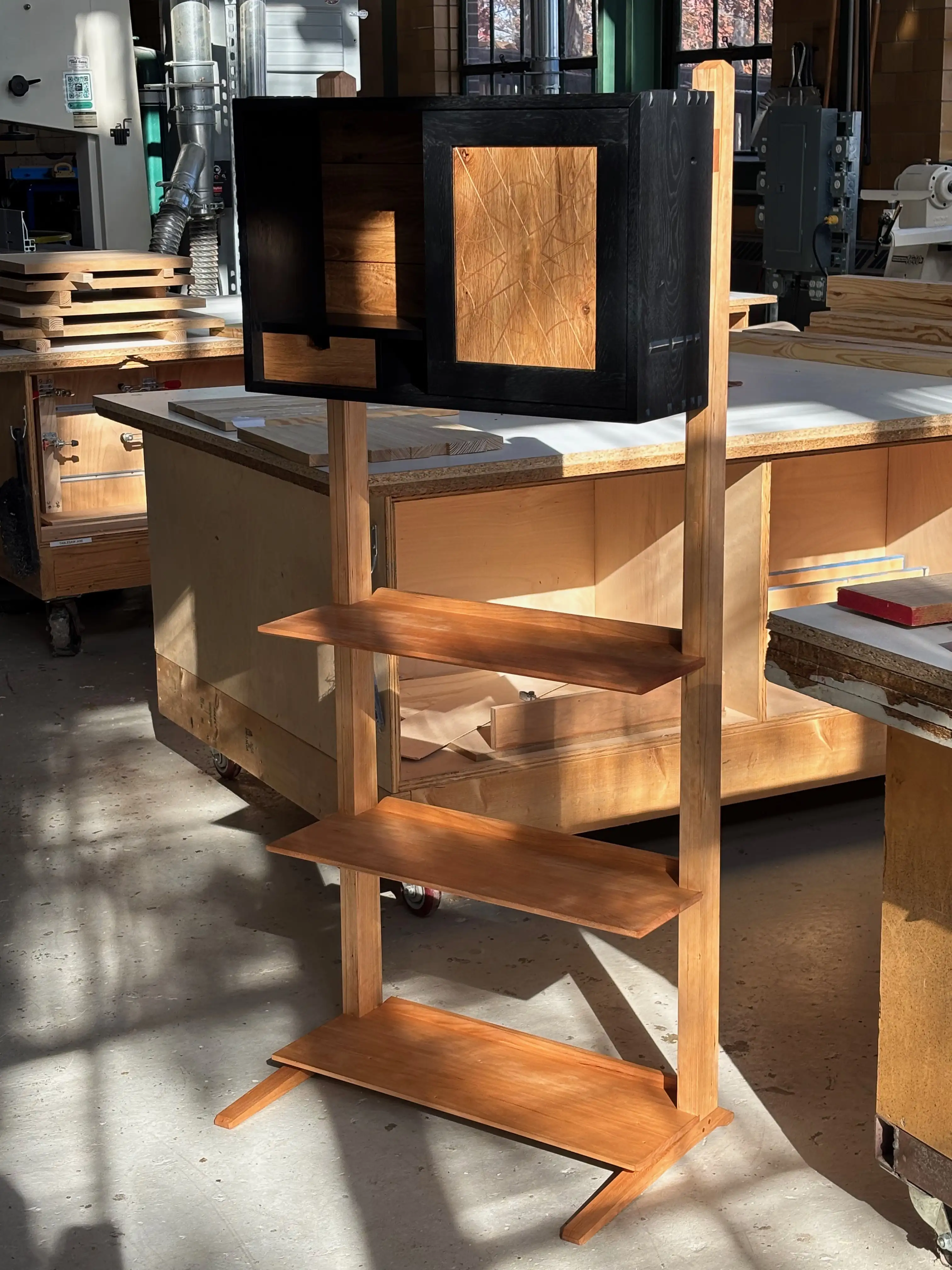 I made a bookshelf out of cherry to hold the cabinet, as I was living in a rented apartment at the time, which prevented me from putting the cabinet in its rightful place on a wall.