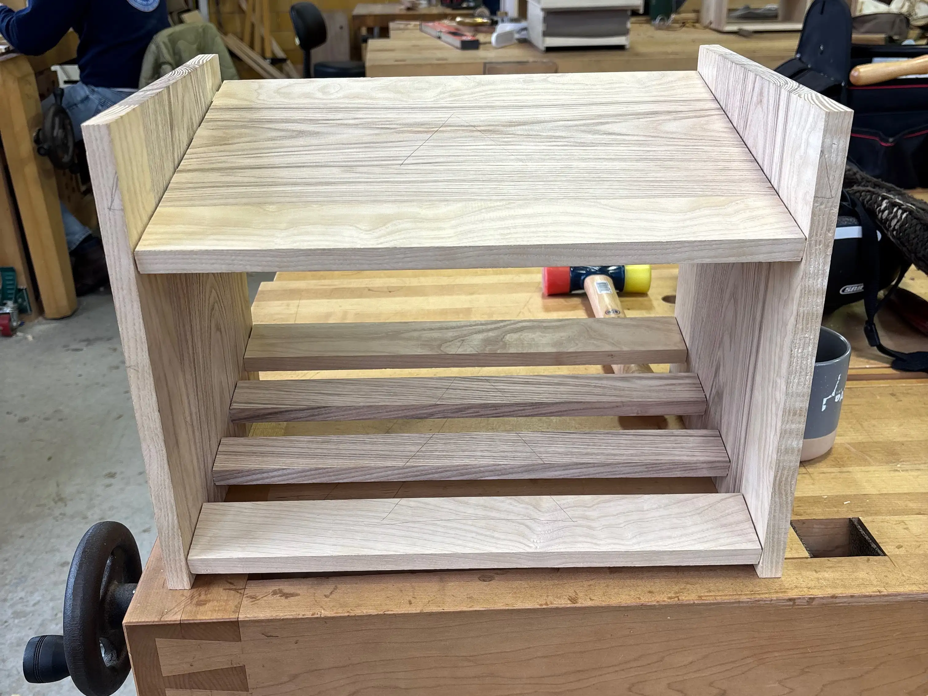 The wood for this started out intended for the Shaker Stool made at SBWI. However, as I chased tearout while planing the boards to thickness, they became to thin to use for that. I held onto them not wanting to waste the lovely contrast between the ash heartwood and sapwood.